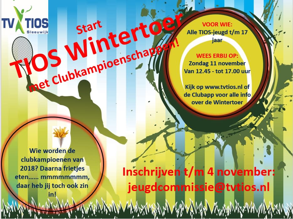 Zondag 11 november is het zo ver, dan start de TIOS Jeugd Wintertoer 2018-2019. De eerste Wintertoer trapt bijzonder af want….. we spelen die middag de Clubkampioenschappen! Bij een tennisclub horen clubkampioenen, daarom wagen we nogmaals een poging. Op 11 november wordt bepaald wie zich een heel jaar jeugdclubkampioen 2018 mag noemen.